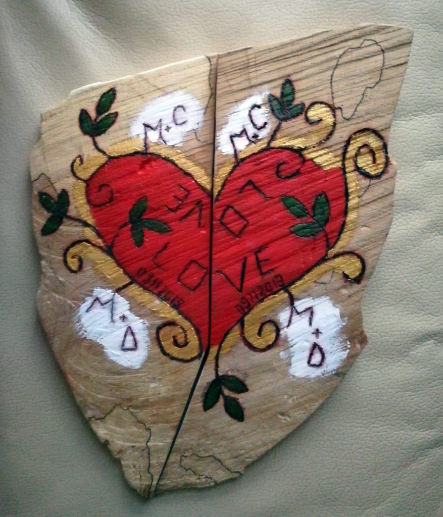 A doua zi, în timp ce mă recuperam, am continuat să mă gândesc și la proiectul cioatei de lemn. Ideea a venit și s-a transformat pe parcurs: era o combinație de lemn, pictură și pirogravare. Rezultatul s-a concretizat apoi în cadoul pe care l-am oferit iubitei mele care mi-a devenit soție în luna noiembrie, simbolic ea primind jumătate din inima mea, în timp ce cealaltă jumătate a fost oferită nașilor noștri spirituali.